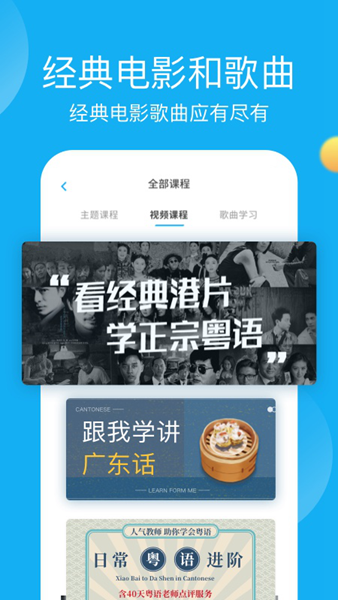 1、粤语学习:精选1000多首古老粤语曲目,从此学歌、聊日记、谈情感...轻松学会粤语歌曲和粤语歌词,玩出新花样,看电影看美剧学港片、玩小游戏。