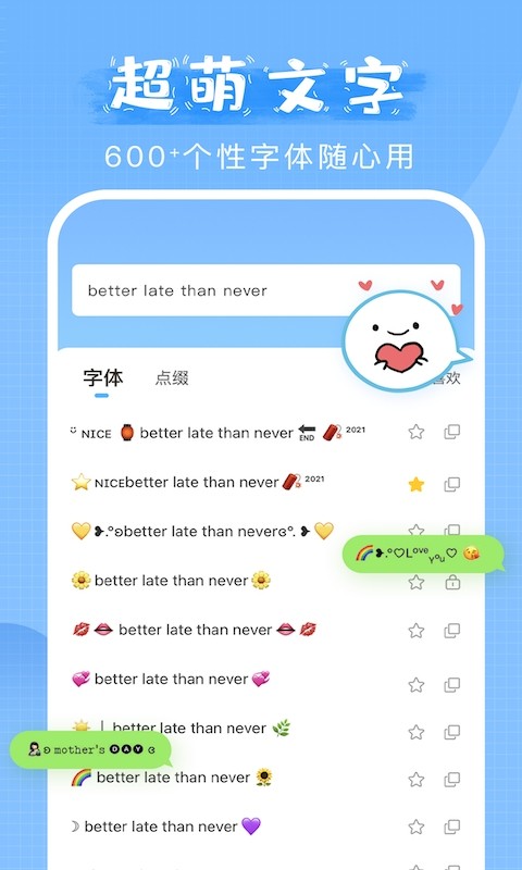 萌文字,一款专为女生打造的字体软件,这里有各种各样的字体样式,用户们可以自由设置;而且萌文字软件还支持在线预览功能,在聊天、玩游戏过程中都能享受到最优质的字体服务,让自己的聊天变得更加有趣,非常的实用;萌文字软件内含海量的字体素材和字号任你挑选下载使用,并且还能根据用户的喜好为你智能推荐可能喜欢的字体类型以及大小等等信息内容。