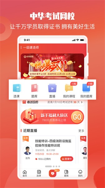 中华考试网app为用户提供了海量优质的职业技能培训课程内容,涵盖了学历、经济、工程、金融、医药等等类型,让您在线轻松刷题。