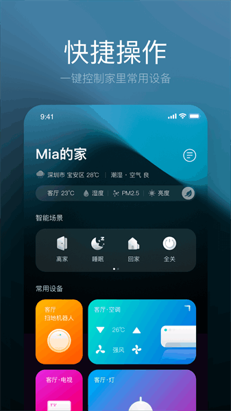 6、智能场景:一键执行各种智能生活场景,如打开窗帘、调节室内温度、设定场景模式、开启闪烁灯光等,享受智能生活的便捷。