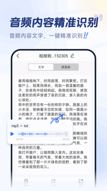 视频转换文字安卓app是支持多种格式的视频转换为MP3,视频、音频等等,满足用户对不同格式视频的要求。无论是在手机上播放还是下载到本地存储中,都能保证高清流畅的输出质量,让您享受更好的视频创作体验。