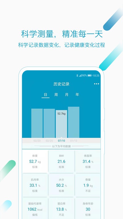 智能记录体重变化,如BMI指数、基础代谢率等,并生成体重趋势图表展示;