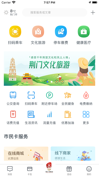 3、另外,打开荆门通卡APP,可以看到荆门卡的所有功能入口。