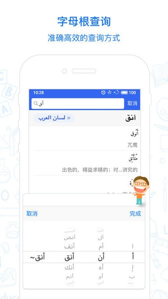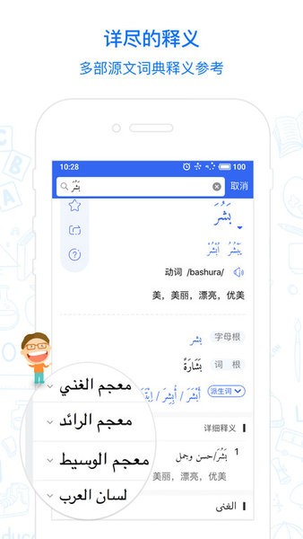 本应用由专业英语教研团队设计制作,是针对广大阿语爱好的人量身打造的一款专业阿汉词典,是目前国内最大的语言学习和翻译软件。本应用支持阿语学习、词汇学习、阿语练习、发音练习、语音输入等功能,并提供阿语学习、词汇查询、阿语练习、语音识别与转换等多种功能;并具有阿语收藏、生词复习计划制定以及拍照查字等实用功能。