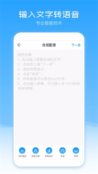 --调节语速、音调和音量,个性化定制背景音乐。