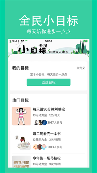 您可以清晰了解到自己的习惯打卡数据,从而更加直观地了解自己每天的打卡习惯情况。全民小目标管理自己使用时间打卡软件是款相当不错的手机工具下载,开启之后用户们可以快速进行自定义设置和选择体验。方便适合我们进行点击和分享哦。