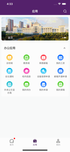 集成了学校各种实用工具,如图书借阅、成绩报告查询、图书馆预约登记、在线报修、网上办事大厅等。