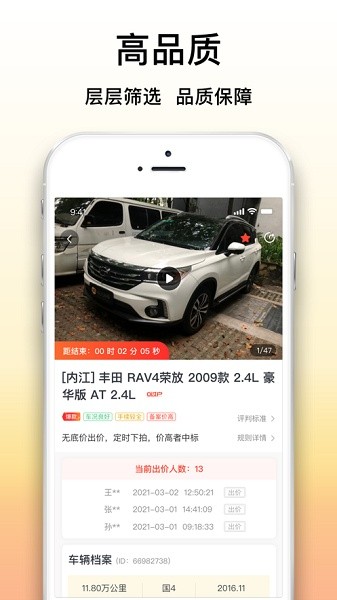 这里拥有海量车型资源可以自由选择购买,线上就能快速参与竞拍,轻轻松松就可以获取更多优质车辆;大象拍车安卓版支持一键查询历史订单信息,让你能够实时掌握自己的所有交易情况,还能直接在线上进行估价、成交等操作,非常方便快捷,让用户买车更放心;大象拍车手机版为你提供专业团队服务,帮助用户解决遇到的问题,享受更高效的购车体验;大象拍车手机版还会及时推送最新的拍卖会消息,随时关注活动动态,有需要的用户就来安下载站下载体验。