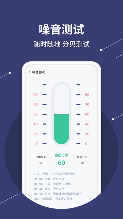 9、分贝测试,提供了多种分贝测试模式任你切换设置,根据个人需求定制喜欢的噪声分贝测试方案。