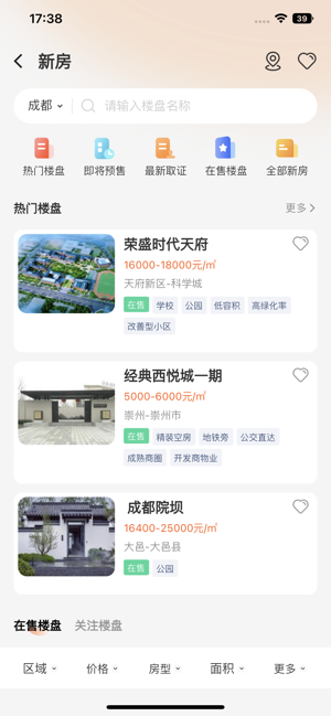 输入小区/楼盘名称/价格/户型/面积/地铁/面积/朝向/面积筛选,即可帮你快速定位附近房源,方便快捷省心。