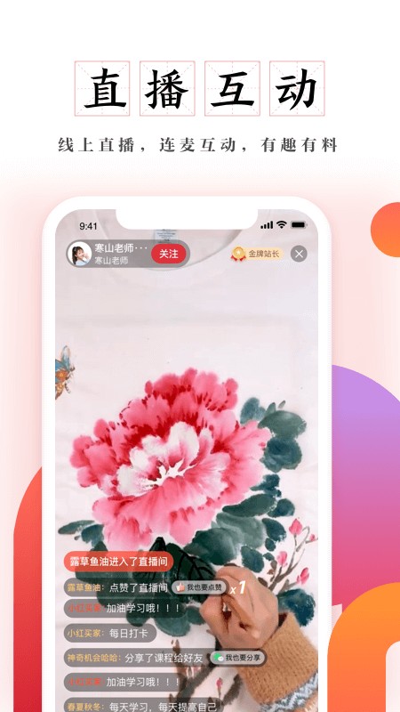 【高效学习工具】及象书画院APP具备智能测评、多终端同步的特点,能够记录每次学习情况,形成个性化的学习计划,助力学生逐步实现进步。及象书画院app是一款专为学生们提供的学习工具,让学生们在家里可以轻松的进行学习。线上有着非常丰富的教学资源可供用户选择观看,同时还有超多课程内容等你来解锁!有需要的朋友们赶快来下载吧!