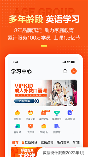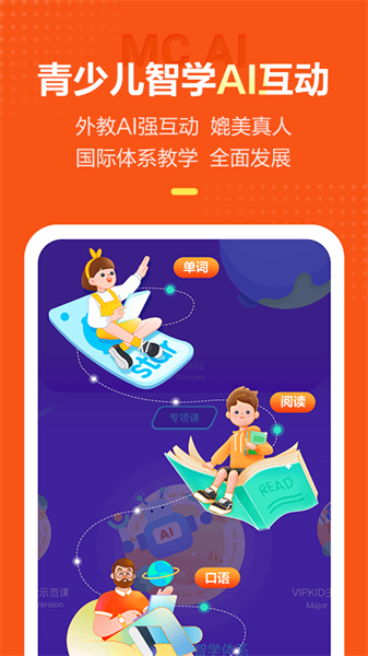 vipkiKid是一款以“浸入式”的教学理念打造的综合性英语学习平台。课程内容以美国小学1年级到8岁小朋友的英语启蒙教材为基础,以国际教育为重点,结合国内外知名教师团队,通过动画、游戏等形式,将英语学习融入日常生活中,通过有趣、生动的互动方式引导孩子学习。