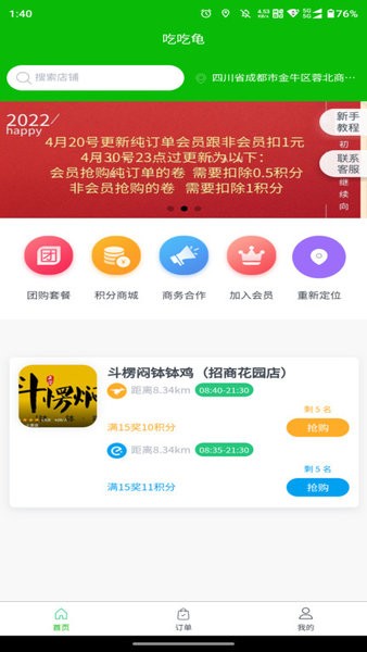 6、积分商城:签到领积分,兑换超值礼品,更有多种奖励活动等你来拿。吃鸡上刷吃鸡外卖平台APP是专为喜欢吃鸡的小伙伴们准备的一款手机端点餐软件,这款软件拥有非常多的美食种类,大家可以在这里找到你喜欢的美食类型,各种各样的美食都有哦,欢迎各位下载使用。