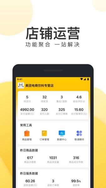 美团电商商家版APP是专为美团电商商家打造的门店管理平台,让您随时随地处理生意,掌握经营状况,高效便捷!快来下载吧!