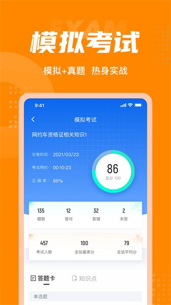网约车司机题库内含考点练习,全国通用卷以及地区卷模拟练习,以及按照固定考试比重的随机式的抽题的真题考场,成绩单实时记录考试数据,一点一滴的反馈考生近期学习状态以及自我正确率的提升,大大的给予考生通过考试的信心。
