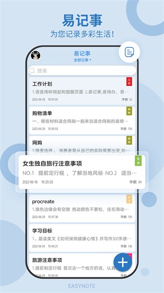 易记事,一款简单好用的笔记本便签日记软件,界面简洁,没有任何多余功能。易记事不仅提供了多种多样的记录方式,包括语音以及文字等形式,而且还具备丰富的主题选择,无论是日常办公还是学习中都可以使用,非常不错,喜欢的朋友欢迎前来本站下载使用!