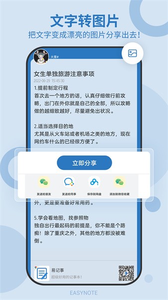 您可以收集您喜欢的内容,并在离线状态下继续阅读。易记事使用简单方便的文字内容选择设置下一个字体为用户们带来最受欢迎的文字体验,在这款app上大家需要用到的各种有趣功能可以满足大家的需求,喜欢的小伙伴快来下载试试吧!
