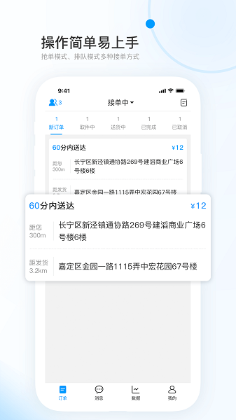 帮助用户快速找到附近的优质订单资源。一键点击即可获取到详细信息内容进行配送操作体验!