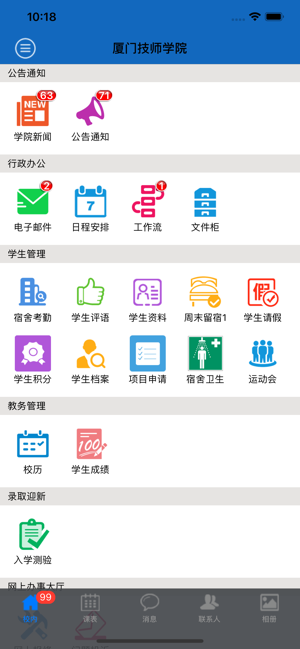 厦门技师师范系统是厦门技师师范系统(APP)配套应用,通过后台登录账号即可查看学生信息、成绩情况等各类信息,并可对个人数据进行管理;同时提供学校资讯、教学视频、校园新闻、社交娱乐等方面的内容发布以及在线咨询等等。