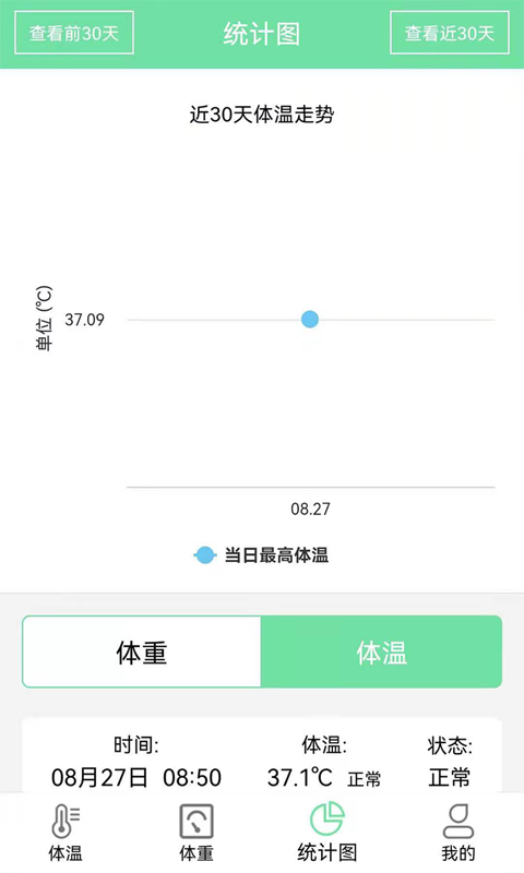 数据分享便捷,选择任意一个体重数据即可将其分享出去。体温健康状态信息显示用户健康状态信息展示app体温健康状态信息显示用户健康状态信息查看,体温度健康状态信息详细介绍了解,体温健康状态信息清晰可见哦,有兴趣的小伙伴快来下载体验吧!