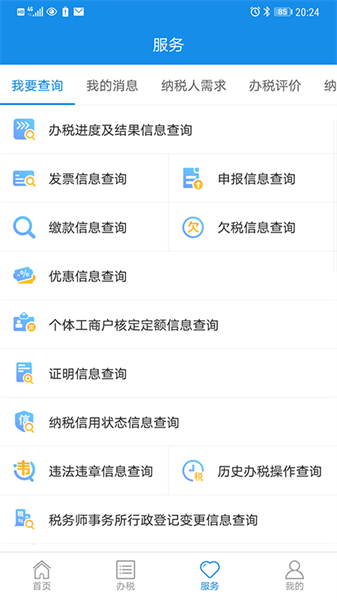 包含发票查验、办税日历、办税地图、征期日历、办税地图、办税指南、大厅流量等功能。