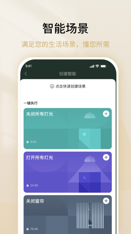 智能场景:提供多种智能场景模式,如回家、离家模式、工作模式等,根据您的生活习惯选择最适合您的场景风格;