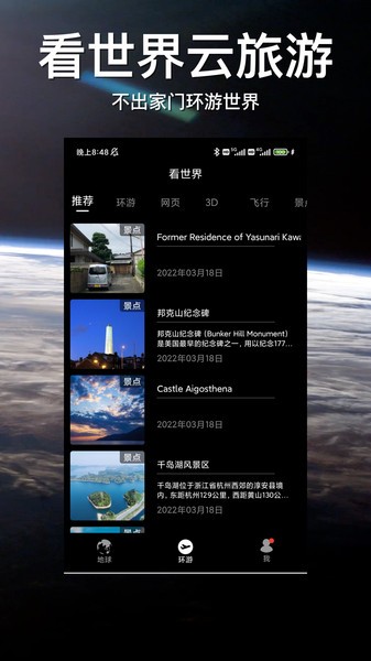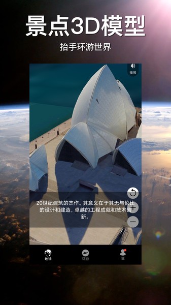 AR技术:结合最新的科技理念,提供3维地球模型的3d地球模型,让用户仿佛置身其中,感受不一样的视觉效果,增加用户的探索乐趣和刺激感。地球上任意位置3D高清卫星地图是为广大用户提供的,在使用这款软件的时候,用户可以随时进行查看,了解全球各地的地理环境。软件提供了卫星地图、VR图片等多种内容和服务,让大家可以轻松探索世界各地。