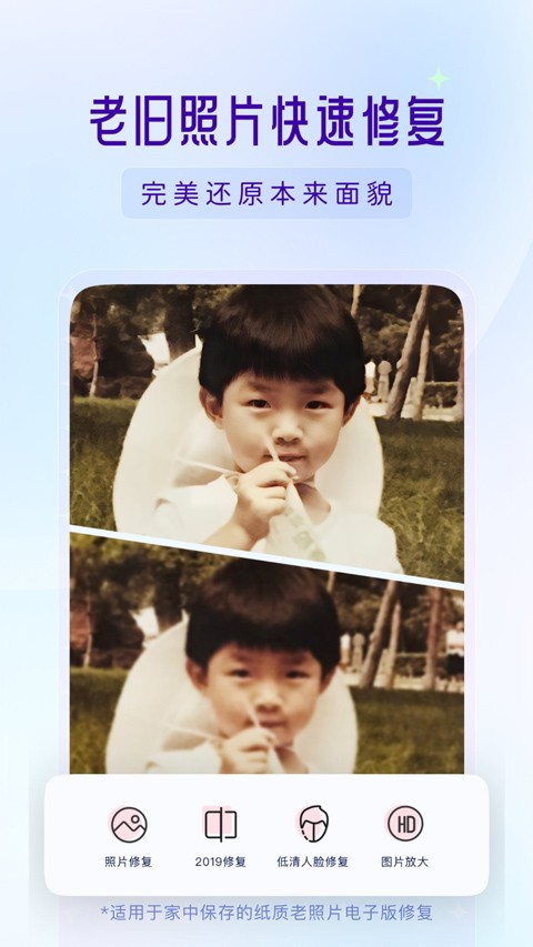 智能修复手机中模糊、低分辨率图片,提高画质和清晰度,让你像看电影一样享受视觉盛宴;:智能人眼、鼻子和牙齿美白效果,让你的照片瞬间变得光彩夺目;:将多张图片合并成为一张,轻松制作拼图,随心所欲编辑;:通过智能修复技术,让您的照片焕然一新;:针对不同场景进行了高清还原处理,确保图片细节完美无缺。
